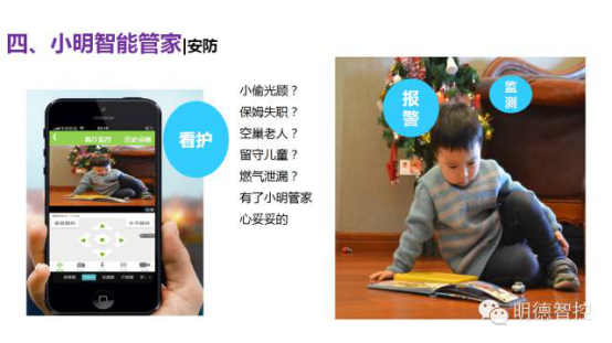明德智控智能管家相当于给您的家安上了眼睛(人体红外感应),鼻子(燃气报警器,烟雾报警),耳朵(门磁,震动感应),时刻感知您的存在,并根据您的行为,调整灯光,插座等设备。当您半夜起来上厕所的时候,不用再摸黑开灯,感应灯会自动开启。因为智能,私人管家随身携带!